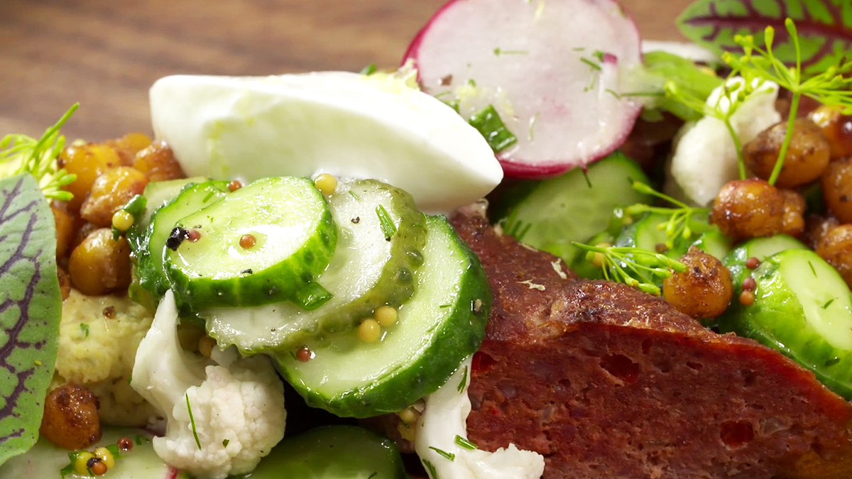 Klobásky podávejte s cizrnou, pyré, květákovým salátek a jogurtem ochuceným citronovou kůrou.